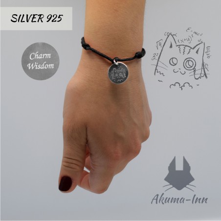 Bracelet with a wise cat Kamal - on the front it has a kitty picture, on the backside inscription "Charm Wisdom". Bracelet made of waxed cord and double-sided engraved silver charm (fineness 925). The perfect idea for a gift. The set also comes with a small decorative bag for your jewellery, and a cleaning cloth.