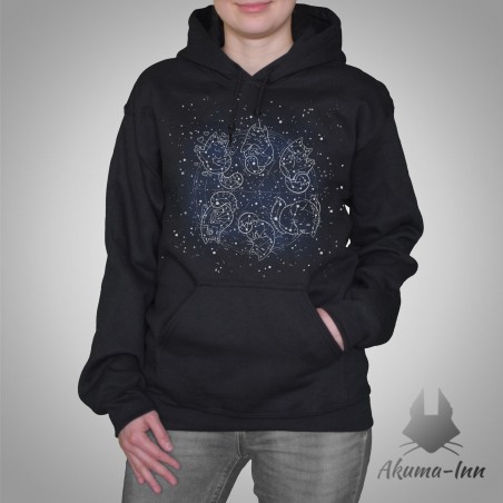 Bluza z gwiezdnymi kotami. Bluza z kapturem i kieszenią typu kangur na drobiazgi, bawełna podszyta polarem. Idealna na zimowe wieczory, których nie chcesz spędzić szczękając zębami. Można bezpiecznie prać w 30 stopniach na lewej stronie.