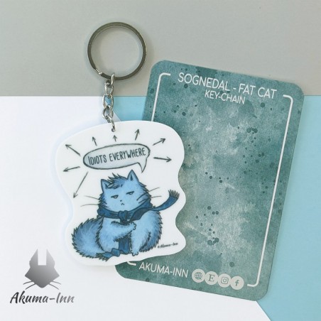 Brelok z kotem Sognedalem otoczonym przez idiotów. Wykonany z utwardzonego plastiku, docinany do kształtu, druk jednostronny. Wymiary breloka około 66 x 61 mm, długość kółka razem z łańcuszkiem około 50 mm. Idealny do kluczy, torby czy plecaka dla każdego szanującego się kociarza!