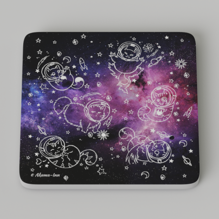 Podkładka pod kubek z kocim kosmosem pełnym Grubych Kotów. Wysokiej jakości nadruk na PCV, wymiary 10x10 cm z zaokrąglonymi rogami, 5 mm wysokości. Żaden kubek jej niestraszny i ochroni każdy blat przed kolejnymi wypalonymi kółkami!