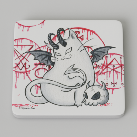 Podkładka pod kubek z kocim Demonem z kolekcji Spooky kotów. Wysokiej jakości nadruk na PCV, wymiary 10x10 cm z zaokrąglonymi rogami, 5 mm wysokości. Żaden kubek jej niestraszny i ochroni każdy blat przed kolejnymi wypalonymi kółkami!