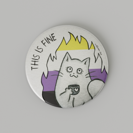 Przypinka z serii LGBT - Non-Binary. Dostępna w rozmiarze 59 mm. Wysokiej jakości wydruk na papierze fotograficznym glossy w połączeniu z mocną, stalową konstrukcją komponentów tworzy ultimate Akumową przypinkę, którą można z dumą nosić i mieć pewność, że This is fine! ;)